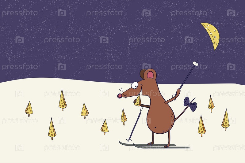 Мультяшный персонаж-забавная мышка катается на лыжах