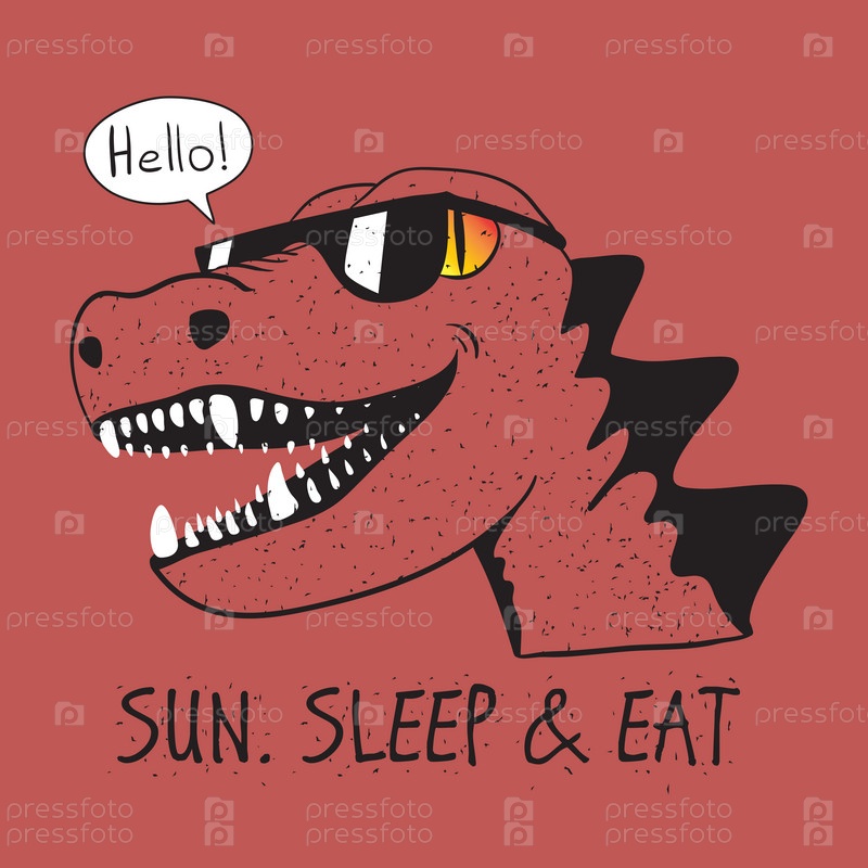 Солнце спи и ешь лозунг и динозавр в солнечных очках с улыбкой поздоровайся