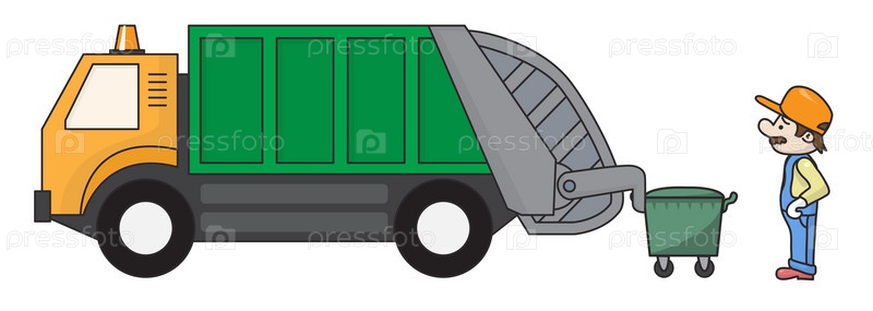 Мусоровоз, мусорный бак и рабочий, убирающий мусор