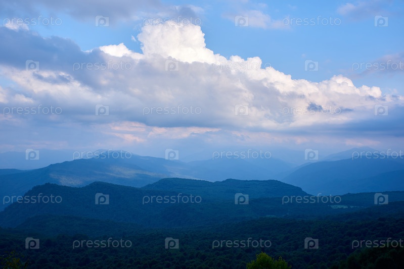 Речевые облака в свете солнца над лесистыми горами