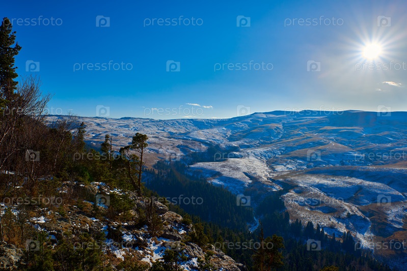 Яркое солнце освещает заснеженное горное плато. На переднем плане сосны. Яркое солнце светит на горное плато