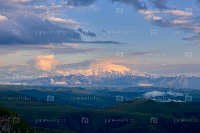 Эльбрус на закате. Эльбрус на закате покрыт шапкой облаков