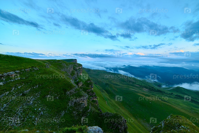 Облака заката, голубое небо и туман над горной долиной с деревней и извилистой дорогой