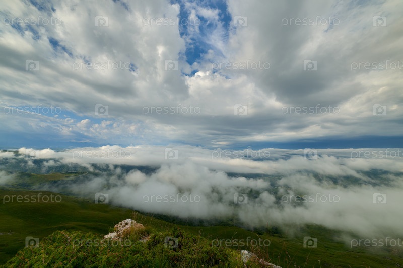 Туман над зеленой горной долиной под кучевыми облаками на восходе солнца