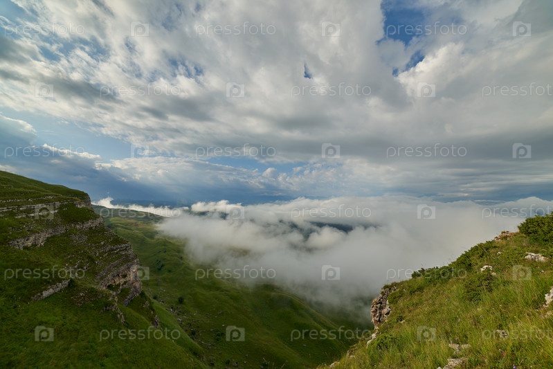 Туман над зеленой горной долиной под кучевыми облаками на восходе солнца