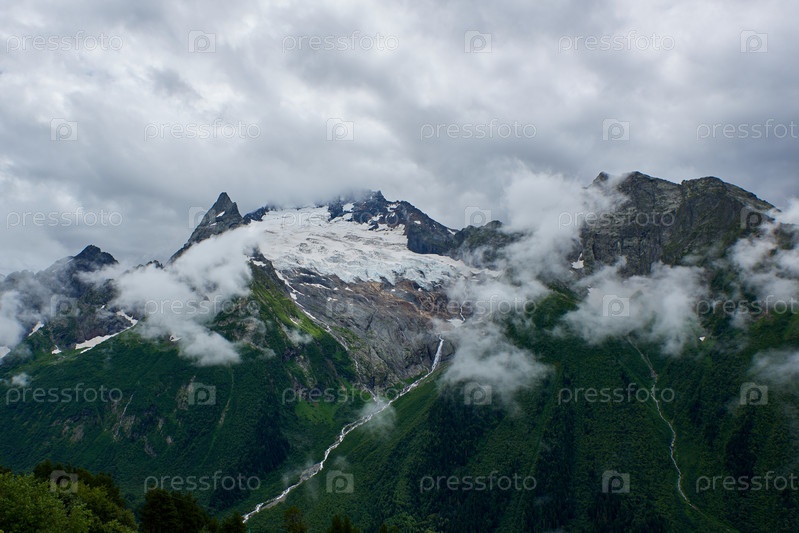 Горный зеленый хребет, покрытый соснами в тумане и облаках. Домбай, Россия