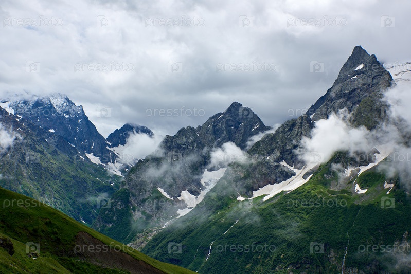 Скалы, покрытые туманом и облаками, с зелеными склонами. Домбай, Россия