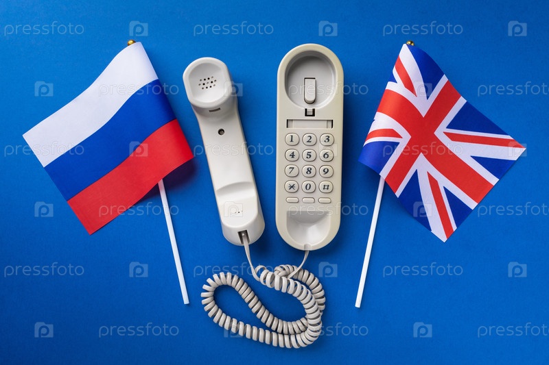 Старый телефон и два флага на синем фоне, концепция на тему телефонных разговоров между Россией и Великобританией