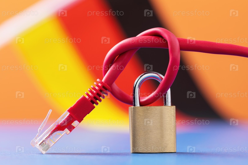 Закрытый замок на завязанном сетевом проводе на фоне немецкого флага, концепция безопасности компьютерных сетей в Германии