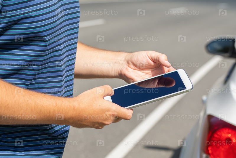 Мужчина с планшетом на дороге возле машины, концепция на тему поиска возможной неисправности на дороге