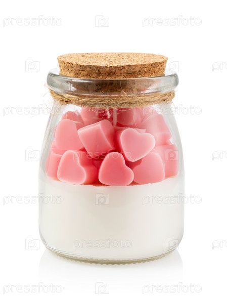 Ароматическая свеча с различными начинками в прозрачной стеклянной банке, изолированной на белом фоне
