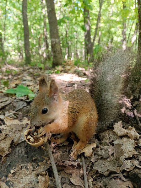 Бельчонок милашка улыбается, держа грецкий орех и сидя в лесу ранней осенью