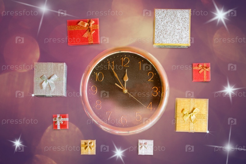Часы и рождественские подарочные коробки на праздничном фоне. Вид сверху