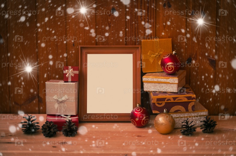Деревянная рама и рождественские подарки на деревянном столе. Посмотреть с копией пространства