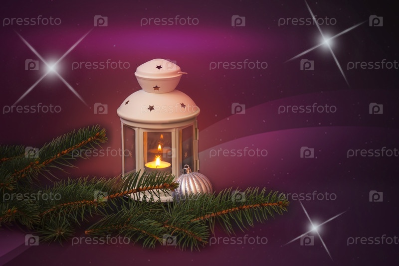 Белый фонарь, еловые ветки и рождественский бал на праздничном фоне. Посмотреть с копией пространства