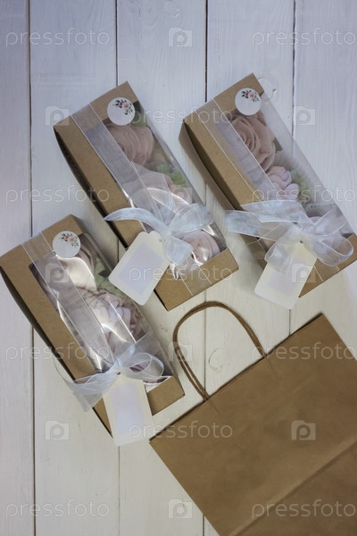 Домашний зефир в бумажных подарочных коробках. Зефирные цветы. Коробочки перевязываются лентой, завязанной в бантик. Три коробки