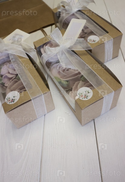 Домашний зефир в бумажных подарочных коробках. Зефирные цветы. Коробочки перевязываются лентой, завязанной в бантик. Три коробки. Тег для текста
