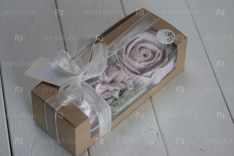 Домашний зефир в бумажной подарочной упаковке. Зефирные цветы. Коробочка перевязана лентой, завязанной в бантик