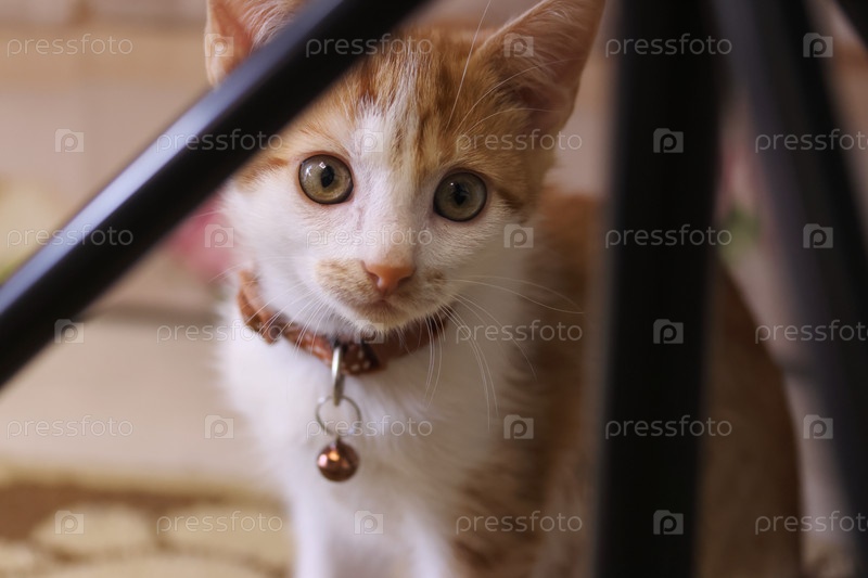 Маленький котенок. Окрас котенка рыжий с белым. Рядом со стойкой освещения. Крупный план