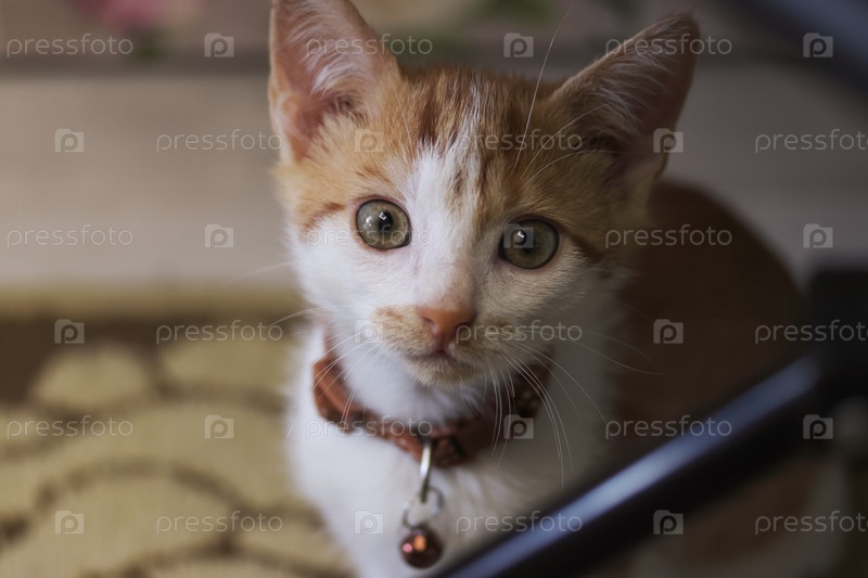 Маленький котенок. Окрас котенка рыжий с белым. Крупный план