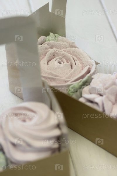 Домашний зефир. Цветы Зефира в бумажной подарочной упаковке. Крупный план