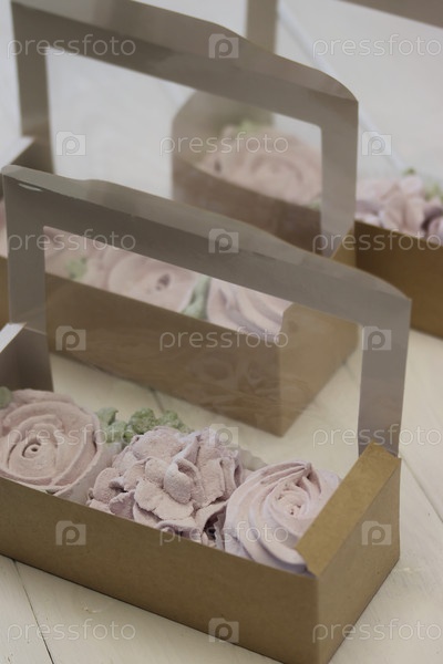 Домашний зефир в коробках. Зефирные цветы. Ящики открыты. На белых досках. Крупный план