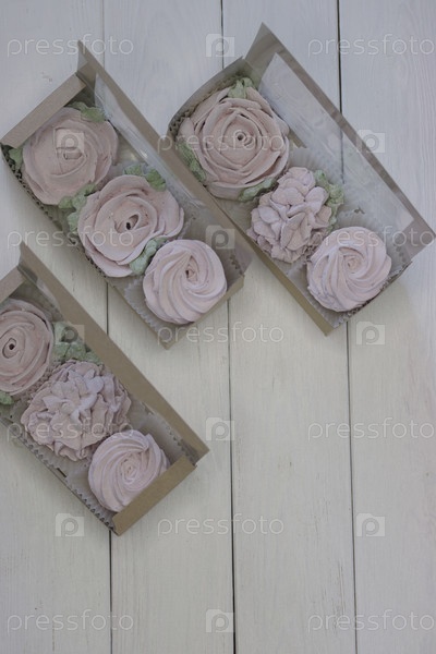 Домашний зефир в коробках. Зефирные цветы. Ящики открыты. На белых досках. Крупный план. Вид сверху