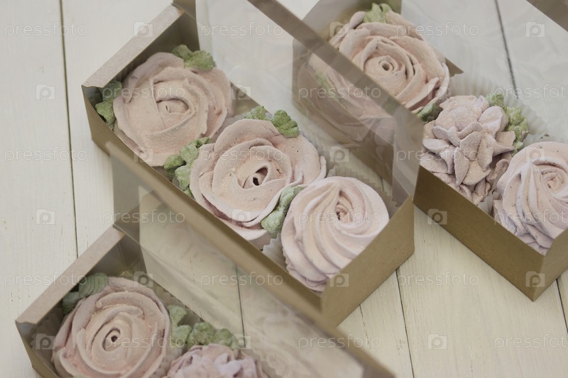 Домашний зефир в подарочных коробках. Зефирные цветы. Ящики открыты. На белых досках. Крупный план