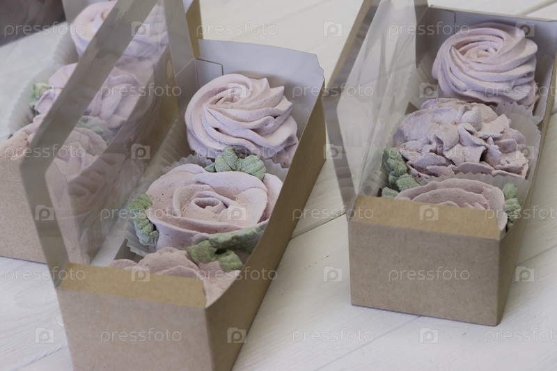 Домашний зефир в подарочных коробках. Зефирные цветы. Ящики открыты. Крупный план