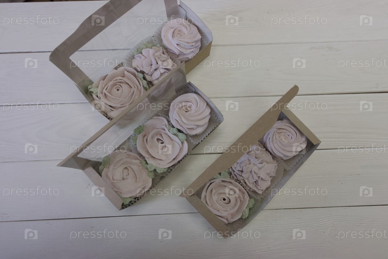 Домашний зефир в бумажных подарочных коробках. Зефирные цветы. Ящики открыты. Вид сверху