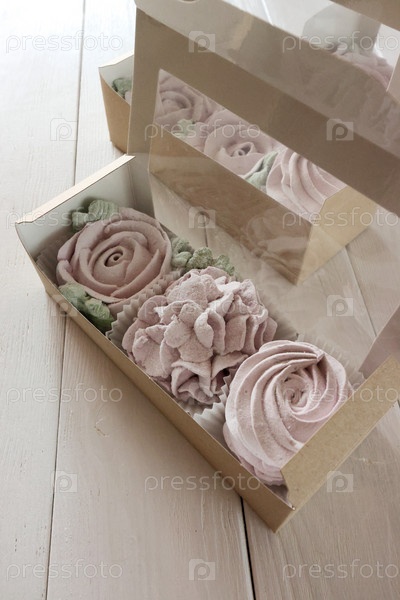 Зефирные цветы. Домашний зефир в бумажных подарочных коробках. Ящики открыты. Крупный план