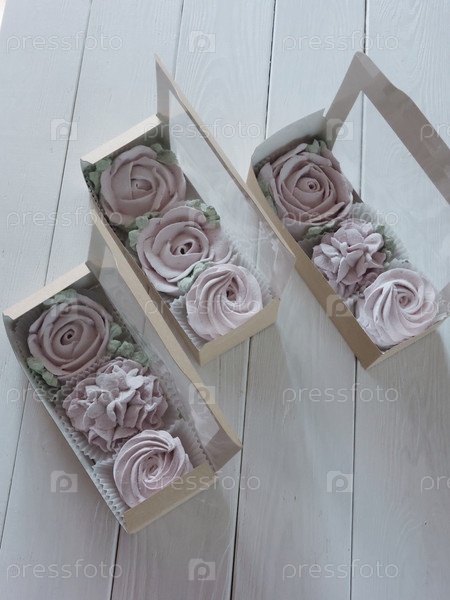Зефирные цветы. Домашний зефир в бумажных подарочных коробках. Ящики открыты. Вид сверху