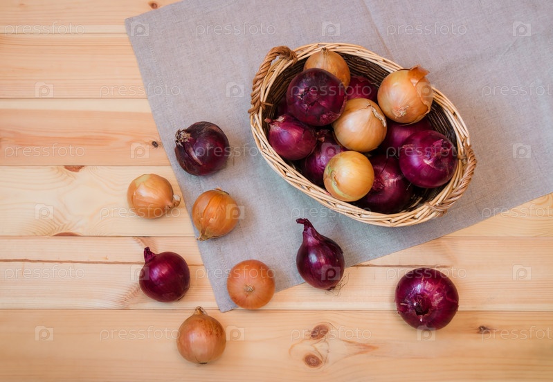 Лук в корзине на деревянных фоне. Вид сверху