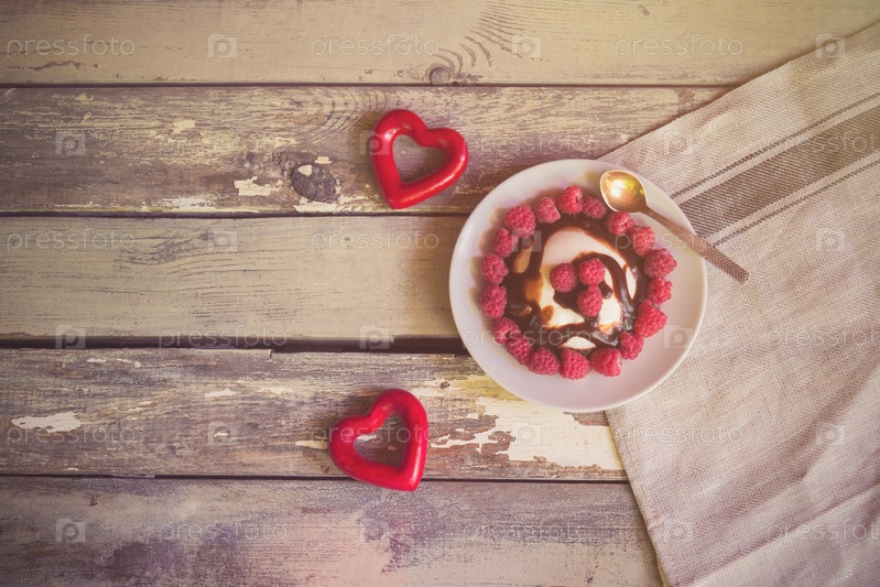 Два красных сердца и итальянский десерт Панна Котта со свежей малиной и шоколадным сиропом на старом деревянном фоне. Вид сверху, пространство для копирования