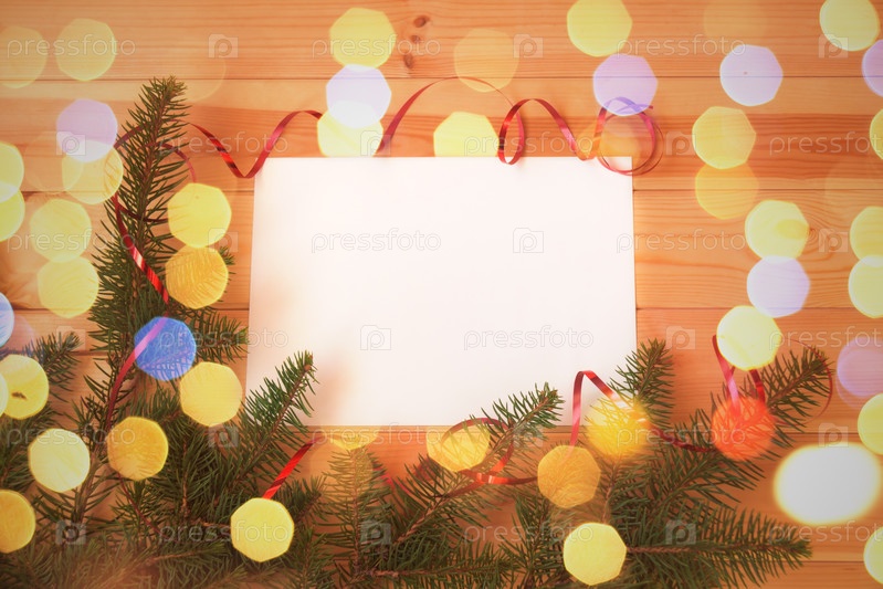 Пустая открытка для текста и рождественская граница из еловых веток и ленты. Плоская планировка, вид сверху