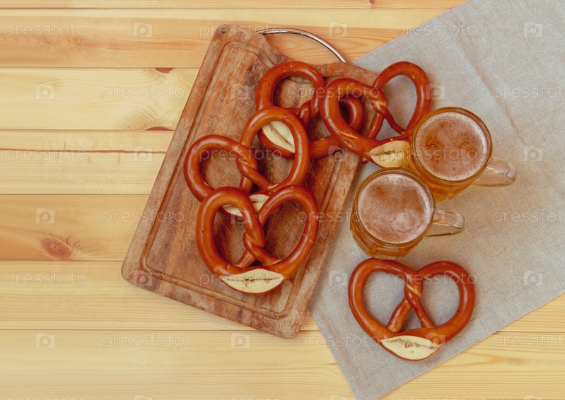 Пивные кружки и свежеиспеченные крендельки на деревянном столе. Вид сверху с местом для копирования