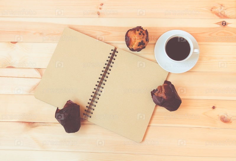Пустой блокнот, кофе и кексы на деревянном фоне. Вид сверху, пространство для копирования