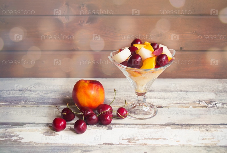 Стеклянная миска с полезным фруктовым салатом и фруктами рядом. Посмотреть с копией пространства