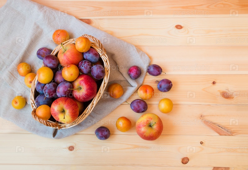 Плетеная корзина с яблоками и красочными сливами на деревянном столе. Вид сверху