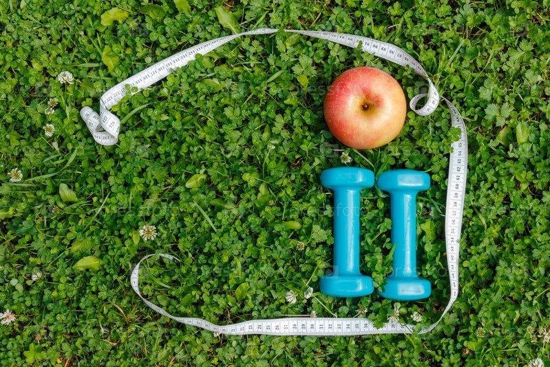 Яблоко, гантели и рулетка на зеленой траве. Вид сверху, пространство для копирования