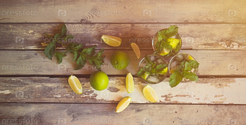 Три стакана коктейля мохито с лаймом и мятой на старом деревянном столе. Вид сверху
