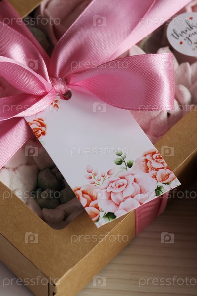 Домашний зефир в бумажной подарочной упаковке. Зефирные цветы. Коробочка перевязана лентой, завязанной в бантик. Тег с полем для текста. Крупный план