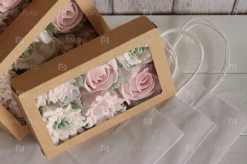 Домашний зефир в бумажной подарочной упаковке. Зефирные цветы. Крупный план
