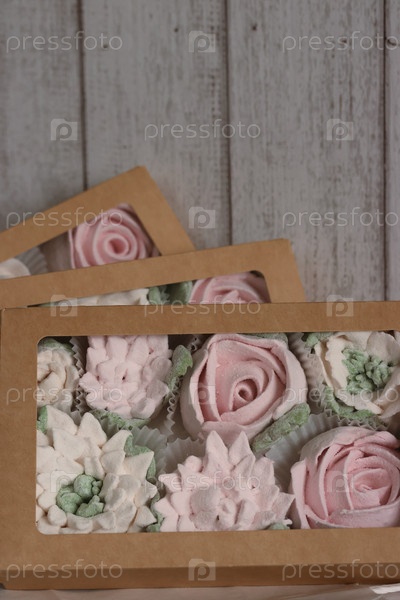 Домашний зефир в бумажной подарочной упаковке. Зефирные цветы. Крупный план
