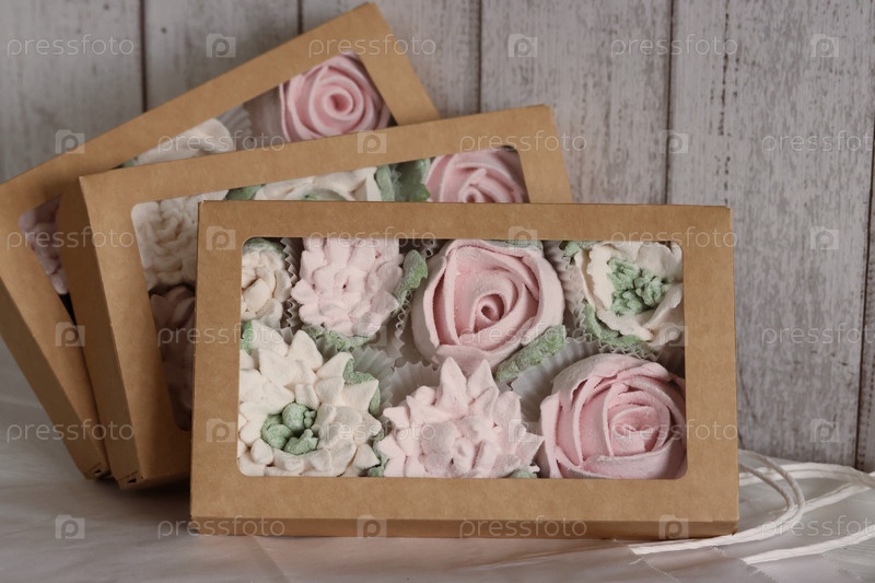 Домашний зефир в бумажной подарочной упаковке. Зефирные цветы. Крупный план