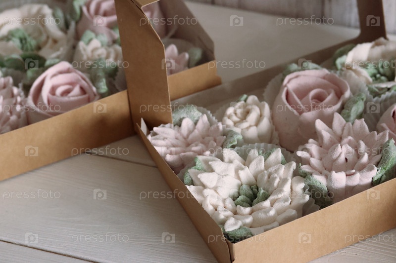 Цветы зефира на подносах. Домашний зефир. Крупный план