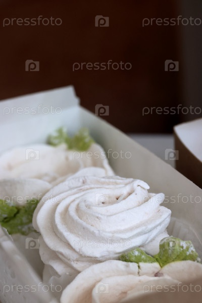 Зефирные цветы. Домашний зефир в бумажной подарочной упаковке. Коробка открыта. Крупный план