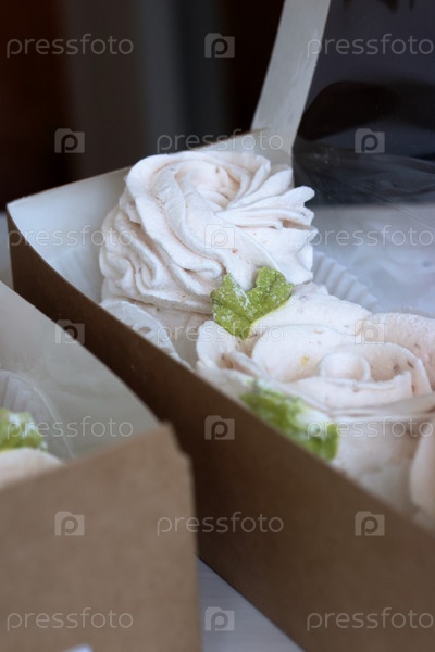 Зефирные цветы. Домашний зефир в бумажных подарочных коробках. Ящики открыты. Крупный план