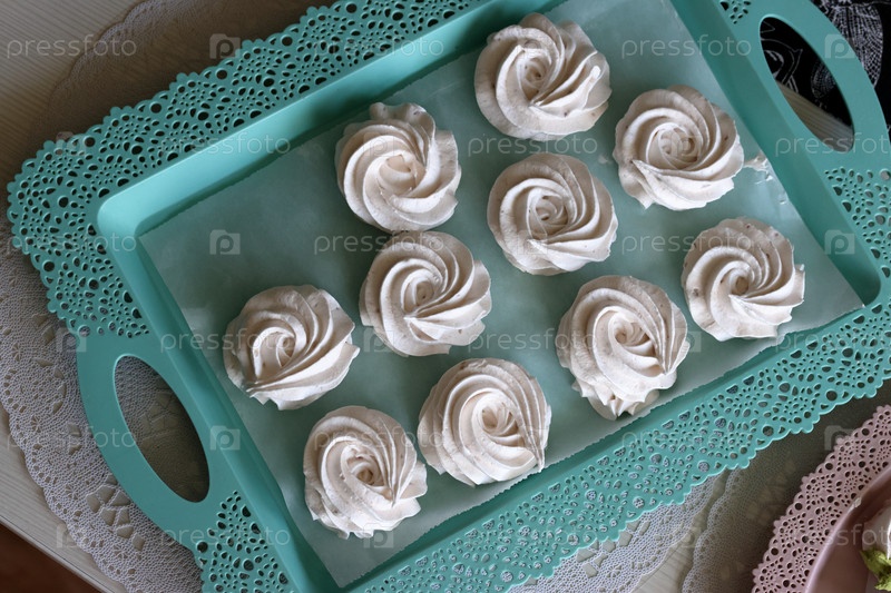 Домашний зефир на подносе. Зефирные цветы. Крупный план. Вид сверху