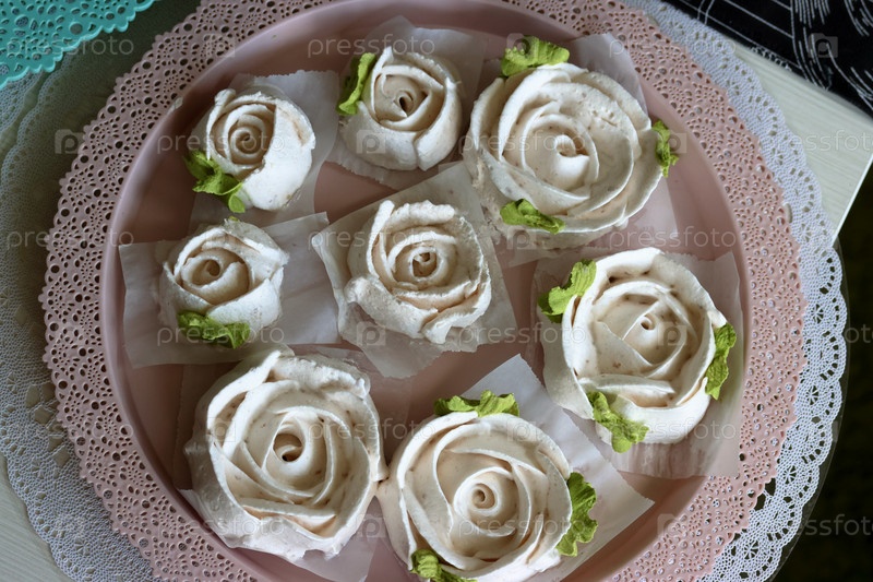 Домашний зефир на подносе. Зефирные цветы. Крупный план. Вид сверху